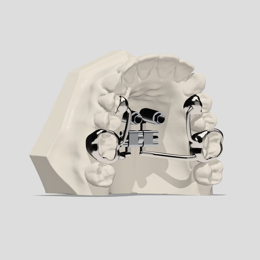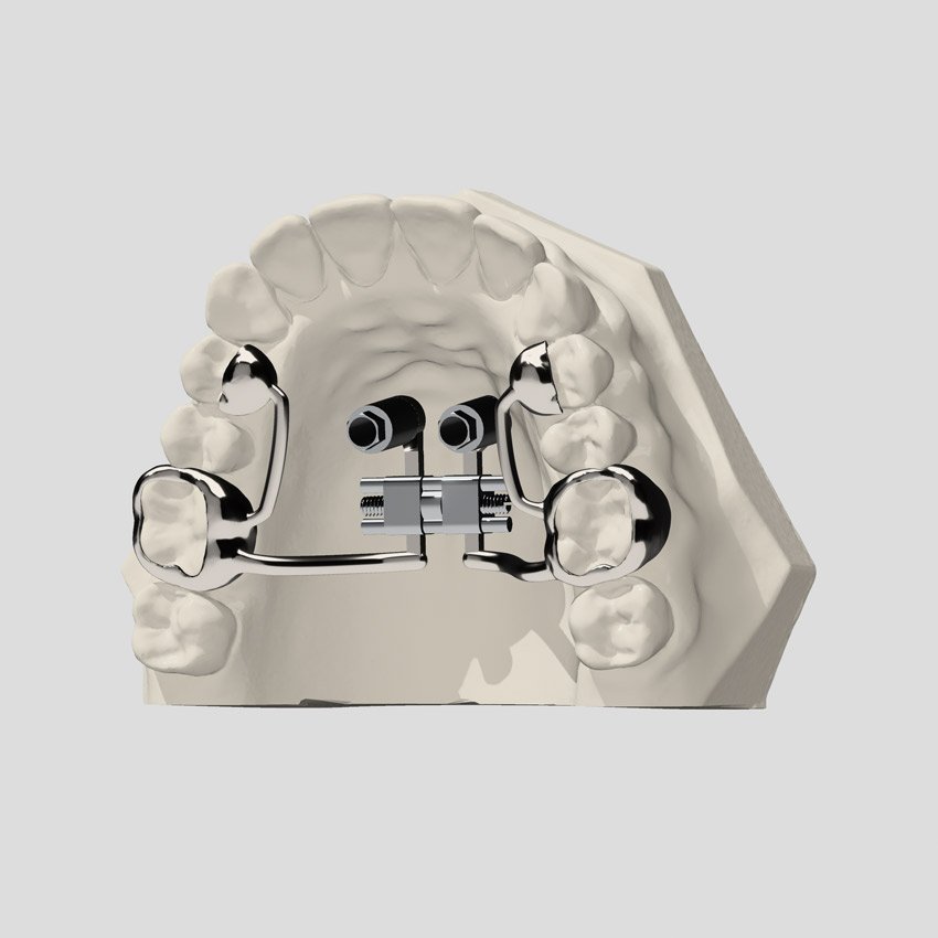 Dispositivo ibrido per l’espansione del mascellare superiore, con ancoraggio scheletrico e dentale.